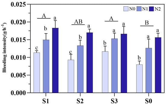 Effects of different soil amendments and different nitrogen sources contents on bleeding intensity at different growth stages under salt stress. N1: ordinary urea, N2: slow-release urea, N0: no nitrogen fertilizer; S1: zeolite amendment, S2: coconut coir amendment, S3: humic acid amendment, S0: no amendment. Different lowercase letters indicate significant differences among different nitrogen fertilizers at the same time for the same amendment, and different uppercase letters indicate significant differences over all times for the same amendment with different nitrogen fertilizers.