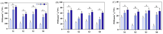 Effects of different soil amendments and different nitrogen sources on peroxidase (POD) at different growth stages under salt stress. Notes: POD: (A) represents the mid-tillering stage, (B) represents the panicle initiation stage, and (C) represents the heading stage. N1: ordinary urea, N2: slow-release urea, N0: no nitrogen fertilizer; S1: zeolite amendment, S2: coconut coir amendment, S3: humic acid amendment, S0: no amendment. Different lowercase letters indicate significant differences between different nitrogen fertilizers for the same soil amendment, and different uppercase letters indicate significant differences between different soil amendments for the same nitrogen fertilizer.