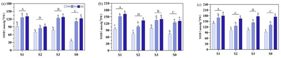Effects of different soil amendments and different nitrogen sources on superoxide dismutase (SOD) activities at different growth stages under salt stress. Notes: SOD: (a) represents the mid-tillering stage, (b) represents the panicle initiation stage, and (c) represents the heading stage. N1: ordinary urea, N2: slow-release urea, N0: no nitrogen fertilizer; S1: zeolite amendment, S2: coconut coir amendment, S3: humic acid amendment, S0: no amendment. Different lowercase letters indicate significant differences between different nitrogen fertilizers for the same soil amendment, and different uppercase letters indicate significant differences between different soil amendments for the same nitrogen fertilizer.