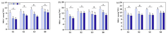 Effects of different soil amendments and different nitrogen sources on the malondialdehyde (MDA) content at different growth stages under salt stress. Notes: (a) represents the mid-tillering stage, (b) represents the panicle initiation stage, and (c) represents the heading stage. N1: ordinary urea, N2: slow-release urea, N0: no nitrogen fertilizer; S1: zeolite amendment, S2: coconut coir amendment, S3: humic acid amendment, S0: no amendment. Different lowercase letters indicate significant differences between different nitrogen fertilizers within the same soil amendment, and different uppercase letters indicate significant differences between different soil amendments.