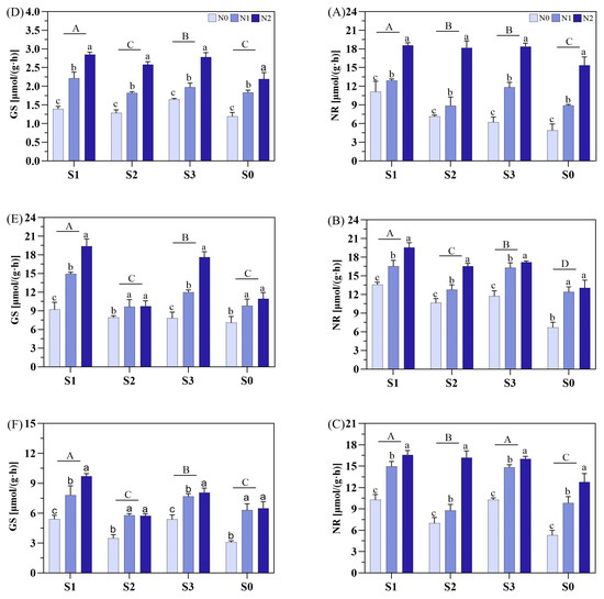 Effects of different soil amendments and different nitrogen sources on nitrate reductase (GS) and nitrate reductase (NR) in different growth stages under salt stress. Notes: GS: (D) represents the mid-tillering stage, (E) represents the panicle initiation stage, (F) represents the heading stage. NR: (A) represents the mid-tillering stage, (B) represents the panicle initiation stage, (C) represents the heading stage. N1: ordinary urea, N2: slow-release urea, N0: no nitrogen fertilizer; S1: zeolite amendment, S2: coconut coir amendment, S3: humic acid amendment, S0: no amendment. Different lowercase letters indicate significant differences between different nitrogen fertilizers within the same soil amendment, and different uppercase letters indicate significant differences between different soil amendments.