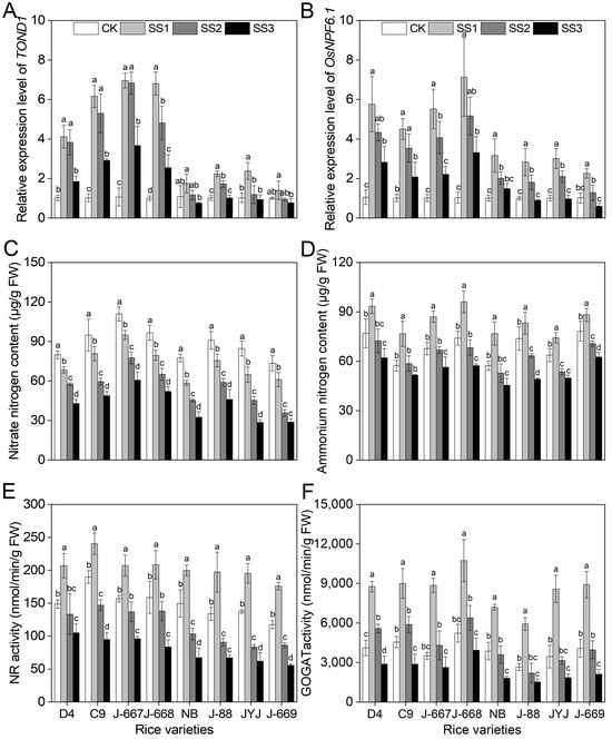 We analyzed the nitrogen-use-efficiency-related gene expression levels, N content, and N metabolism enzyme activities to evaluate the nitrogen-use efficiency of all the tested rice varieties. TOND1 is the gene that indicates the tolerance of nitrogen deficiency; overexpression of TOND1 can increase the tolerance of rice to low nitrogen levels []. OsNPF6.1 encodes a nitrogen transporter protein, which can be used to estimate nitrogen-use efficiency in plants []. As shown in Figure 1, salt stress induced the upregulation of TOND1 and OsNPF6.1; meanwhile, the gene expression levels of TOND1 and OsNPF6.1 decreased with an increase in salinity. The nitrogen-efficient rice varieties showed higher expression levels of TOND1 and OsNPF6.1. Compared with the CK treatment, the expression levels of TOND1 were upregulated by 485.5%, 404.7%, and 166.3% under the SS1, SS2, and SS3 treatments, respectively, using nitrogen-efficient rice varieties. Meanwhile, they were upregulated by 88.5% and 21.4% under the SS1 and SS2 treatments, respectively, and decreased by 15.7% under the SS3 treatment using nitrogen-inefficient rice varieties (Figure 1A). Compared with the CK treatment, the expression levels of OsNPF6.1 were upregulated by 459.2%, 317.4%, and 154.2% under the SS1, SS2, and SS3 treatments, respectively, in the nitrogen-efficient rice varieties. Meanwhile, they were upregulated by 179.1% and 78.6% under the SS1 and SS2 treatments, respectively, and were decreased by 2.2% under the SS3 treatment using nitrogen-inefficient rice varieties (Figure 1B).
