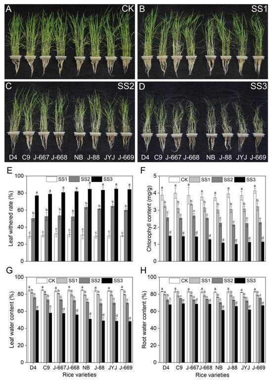 As shown in Figure 2, salt stress caused remarkable seedling death in the different rice varieties, as shown by the higher leaf-withering rate and lower chlorophyll and water content. The leaf-withering rate showed an increasing tendency with the increase in salinity, while the chlorophyll and water contents showed decreasing tendencies. Compared with the CK treatment, the leaf-withering rates increased by 28.9–32.1%, 50.3–64.8%, and 77.1–84.9% under the SS1, SS2, and SS3 treatments, respectively, and the chlorophyll contents decreased by 13.3–23.4%, 30.8–45.9%, and 61.7–74.6%, respectively (Figure 2E,F). The average leaf-withering rates of the nitrogen-efficient rice varieties were 30.6%, 52.2%, and 79.6% under the SS1, SS2, and SS3 treatments, respectively, with rates of 29.8%, 62.5%, and 84.3% in the nitrogen-inefficient rice varieties (Figure 2E). The salt stress-induced decrease range in the chlorophyll content of the nitrogen-efficient rice varieties was decreased by 3.8%, 9.7%, and 8.8% under the SS1, SS2, and SS3 treatments, respectively (Figure 2F). Compared with the CK treatment, the average leaf water contents in the nitrogen-efficient rice varieties decreased by 4.0%, 10.5%, and 26.3% under the SS1, SS2, and SS3 treatments, respectively, with decreases of 5.1%, 14.7%, and 35.4% in the nitrogen-inefficient rice varieties (Figure 2G). Compared with the CK treatment, the average root water contents in the nitrogen-efficient rice varieties decreased by 4.3%, 9.1%, and 14.5% under the SS1, SS2, and SS3 treatments, respectively, with decreases of 4.9%, 9.9%, and 18.7% in the nitrogen-inefficient rice varieties (Figure 2H).