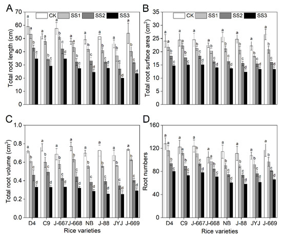 Root growth indexes of different nitrogen-efficient rice varieties under salt stress conditions. Dongdao-4 (D4), Changbai-9 (C9), Jinongda-667 (J-667), and Jinongda-668 (J-668) were used as the nitrogen-efficient rice (NER) varieties. Nipponbare (NB), Jijing-88 (J-88), Jiyujing (JYJ), and Jinongda-669 (J-669) were used as the nitrogen-inefficient rice (NIR) varieties. Two-week-old rice seedlings were treated with distilled water (CK) and salt stress-stimulated using 50 (SS1), 100 (SS2), and 150 (SS3) mmol/L NaCl. Total root length (A), total root surface areas (B), total root volume (C), and root numbers (D) were measured on the 7th day of salt stress treatments. Values are presented as means ± SD, n = 3. Different letters on the column represent significant differences (p < 0.05) between different treatments of the same rice varieties based on Duncan’s test.