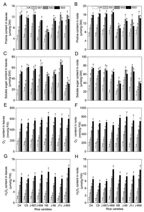 Salt stress affected the osmotic regulation system and antioxidant defense system, as shown by an overaccumulation of proline, soluble sugar, O2·−, and H2O2, in rice seedlings (Figure 4). Compared with the CK treatment, the proline contents were increased by 63.3–95.7%, 143.7–204.8%, and 109.1–215.7% in leaves and by 30.0–57.1%, 100.2–130.7%, and 64.4–154.1% in roots under the SS1, SS2, and SS3 treatments, respectively, in all tested rice varieties (Figure 4A,B). Compared with the CK treatment, the soluble sugar contents were increased by 63.1–124.0%, 164.8–274.0%, and 144.6–298.2% in the leaves and by 65.9–125.5%, 127.6–223.4%, and 119.0–242.7% in the roots under the SS1, SS2, and SS3 treatments, respectively (Figure 4C,D). The salt stress-induced range increases in proline and soluble sugar contents in both the leaves and the roots in the nitrogen-efficient rice varieties were higher than those in the nitrogen-inefficient rice varieties (Figure 4). With the increase in salinity, the proline and soluble sugar content were increased in the most nitrogen-efficient rice varieties, while they were decreased under the SS3 treatment in the nitrogen-inefficient rice varieties (Figure 4).