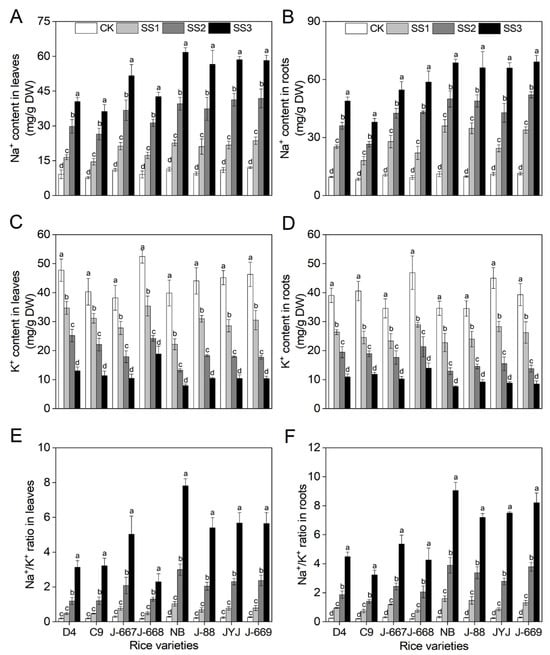 Compared with the CK treatment, the Na+ contents were increased by 88.4%, 237.6%, and 363.8% in the leaves and by 144.6%, 289.3%, and 427.4% in the roots under the SS1, SS2, and SS3 treatments for the nitrogen-efficient rice varieties; meanwhile, they were increased by 104.3%, 267.1%, and 440.1% in the leaves and by 199.5%, 348.9%, and 524.9% in the roots under the SS1, SS2, and SS3 treatments for the nitrogen-inefficient rice varieties (Figure 5A,B). The salt stress-induced K+ decrease range of the nitrogen-efficient rice varieties was lower than that of the nitrogen-inefficient rice varieties. Compared with the CK treatment, the K+ contents were decreased by 70.3% in the leaves and 70.9% in the roots of the nitrogen-efficient rice varieties; meanwhile, they were decreased by 77.7% in the leaves and 77.6% in the roots of the nitrogen-inefficient rice varieties under the SS3 treatment (Figure 5C,D). Compared with the CK treatment, the Na+/K+ ratio was increased by 160.7%, 580.7%, and 1494.1% in the leaves and by 278.8%, 714.9%, and 1714.0% in the roots under the SS1, SS2, and SS3 treatments for the nitrogen-efficient rice varieties; meanwhile, they were increased by 222.0%, 860.0%, and 2328.1% in the leaves and 352.0%, 1105.1%, and 2696.7% in the roots under the SS1, SS2, and SS3 treatments for the nitrogen-inefficient rice varieties (Figure 5E,F).