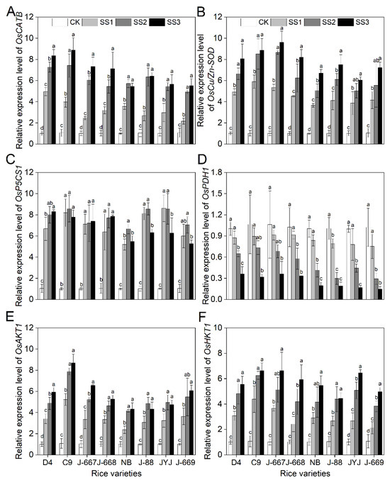The ROS-scavenging related genes OsCATB and OsCu/Zn-SOD, the proline-biosynthesis-related gene OsP5CS1, and the Na+ and K+ transporter protein genes OsAKT1 and OsHKT1 were remarkably induced by salt stress; meanwhile, the proline catabolism-related gene OsPDH1 was suppressed by salt stress (Figure 6). The expression levels of OsCATB, OsCu/Zn-SOD, OsP5CS1, OsAKT1, and OsHKT1 were more induced in the nitrogen-efficient rice varieties, as shown by the higher upregulated range, than they were in the nitrogen-inefficient rice varieties (Figure 6). Compared with the CK treatment, the expression levels of OsCATB and OsCu/Zn-SOD for the nitrogen-efficient rice varieties were increased by 669.7% and 756.6% under the SS3 treatment; meanwhile, they were increased by 458.0% and 571.8% under the SS3 treatment for the nitrogen-inefficient rice varieties (Figure 6A,B). Compared with the CK treatment, the expression levels of OsP5CS1 in the nitrogen-efficient rice varieties increased by 662.3%; meanwhile, they were increased by 475.4% in the nitrogen-inefficient rice varieties under the SS3 treatment (Figure 6C). Compared with the CK treatment, the salt-suppressed expression levels of OsPDH1 in the nitrogen-efficient rice varieties were lower than they were in the nitrogen-inefficient rice varieties, as shown by the following levels: 13.4%, 36.4%, and 66.9% in the nitrogen-efficient rice varieties and 21.6%, 64.0%, and 82.6% in the nitrogen-inefficient rice varieties under the SS1, SS2, and SS3 treatments (Figure 6D). The Na+ and K+ transporter protein genes OsAKT1 and OsHKT1 were more induced in the nitrogen-efficient rice varieties under salt stress conditions. Compared with the CK treatment, the expression levels of OsAKT1 and OsHKT1 in the nitrogen-efficient rice varieties were increased by 534.7% and 502.4% under the SS3 treatment; meanwhile, they were increased by 383.9% and 414.4% under the SS3 treatment in the nitrogen-inefficient rice varieties (Figure 6E,F).