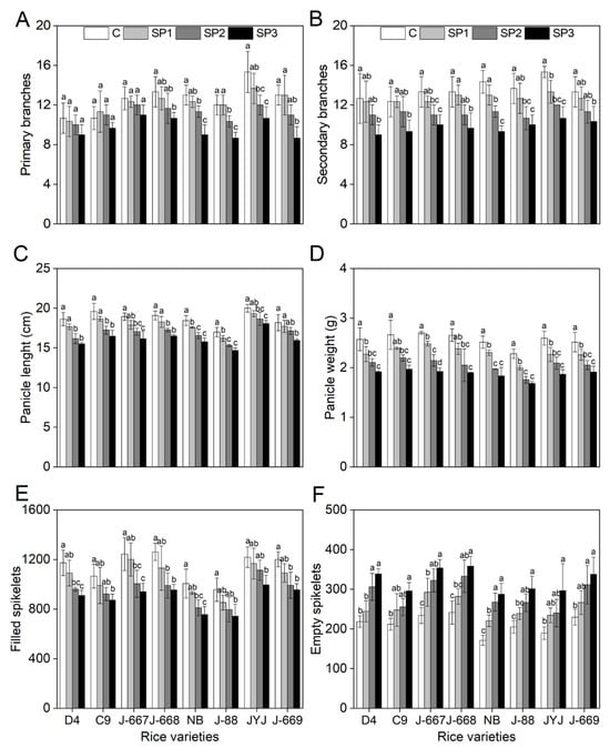 As shown in Figure 7, salt stress caused an obvious inhibition of plant growth for different rice varieties, as shown by the decrease in primary branches (PBs), secondary branches (SBs), panicle length (PL), panicle weight (PW), and filled spikelets (FSs), and the increase in empty spikelets (ESs). The nitrogen-efficient rice varieties showed better growth indexes under salinized paddy soils. Compared with the CK (C) treatment, the PBs of the nitrogen-efficient rice varieties decreased by 1.1%, 5.5%, and 14.5% under the SP1, SP2, and SP3 treatments; meanwhile, they decreased by 4.0%, 16.8%, and 30.6% in the nitrogen-inefficient rice varieties (Figure 7A). Compared with the CK (C) treatment, the SBs of the nitrogen-efficient rice varieties decreased by 3.2%, 14.6%, and 26.4% under the SP1, SP2, and SP3 treatments; meanwhile, they decreased by 8.7%, 21.9%, and 28.7% in the nitrogen-inefficient rice varieties (Figure 7B). There were small differences in the salt stress-induced decreases in PL, PW, and FS between the nitrogen-efficient and -inefficient rice varieties; meanwhile, the salt stress-induced range increases on the ESs of the nitrogen-inefficient rice varieties were higher than those of the nitrogen-efficient rice varieties (Figure 7C–F).
