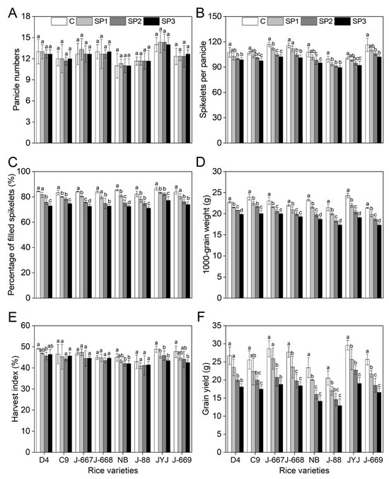 At the mature stage, all rice plants were harvested to determine the following parameters: shoot length (SL); shoot dry weight (SDW); primary branches (PBs) and secondary branches (SBs) of panicles; panicle length (PL); panicle weight (PW); yield components, including panicle number (PN), spikelets per panicle (SP), number and weight of filled spikelets (FSs) and empty spikelets (ESs), percentage of filled spikelets (PFS), 1000-grain weight (TGW), harvest index (HI), and grain yield (GY). The GY and yield components were measured according to the method described by Liu et al. []. The TGW and aboveground biomass were adjusted to a 0.14 g/g moisture content on a dry weight basis. HI was calculated as the GY divided by the aboveground biomass.