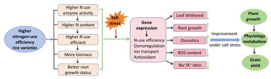In summary, in this study, nitrogen-efficient rice varieties achieved the following outcomes: they obtained higher nitrogen-use efficiency; they maintained higher nitrogen levels under salt stress conditions, enabling them to motivate the gene expression regulatory network and increase the capacity of osmotic adjustment, ion transport, and antioxidant defense; and they showed alleviated osmotic stress, ion toxicity, and oxidative stress; in turn, they showed improved plant growth, physiological metabolism status, and grain yield under salt stress conditions.