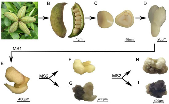 P. ostii was grown in a germplasm nursery in Hangzhou, Zhejiang Province, China. Immature pods of P. ostii were collected at approximately 80–90 days post-anthesis (DPA) (Figure 1A,B). Seeds were dissected and soaked in detergent for approximately 5 min, washed under running tap water for 10 min, sterilized with 75% ethanol for 2 min and 3% NaClO for 10 min, and then rinsed five times with sterile water (Figure 1B,C). Using a sterile scalpel and tweezers, embryos were fetched out and treated with 1M sucrose solution at 4 °C for 2 days. The surface of the embryos was dried to prepare them as explants (T0, Figure 1D).