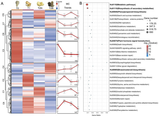 A total of 75,934 expressed genes were grouped into eight clusters (Figure 4A), and 23,843 differentially expressed genes (DEGs) were identified among the six samples. Among these DEGs, 4017 genes were specially up-regulated in T2N, while 2169 genes were up-regulated in T2B (Figure 4B). KEGG enrichment analysis revealed that these genes were associated with the “plant hormone signal transduction” pathway (Ko04075), the “biosynthesis of secondary metabolites pathway” pathway (Ko01110), the “glutathione metabolism” pathway (Ko00480), the “phenylpropanoid biosynthesis” pathway (Ko00940), “metabolic pathways” (Ko01100), the “nitrogen metabolism” pathway (Ko00910), and the “biosynthesis of various plant secondary metabolites” pathway (Ko00999) (Figure 4C). Combined with the KEGG enrichment analysis of the metabolome, the “phenylpropanoid biosynthesis” pathway (Ko00940) was enriched in both analyses, suggesting that this pathway plays a crucial role in the callus browning of P. ostii.