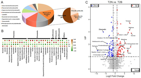 Metabolites categories and differentially accumulated metabolites between T2N and T2B. (A) Volcano plot of differentially accumulated metabolites between T2N and T2B. (B) Statistical analysis of metabolite categories. (C) Accumulation patterns of flavonoid compounds.