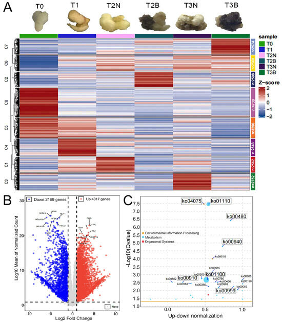Analysis DEGs in transcriptome. (A) Gene expression pattern during the callus formation process among T0, T1, T2N, T2B, T3N, and T3B. (B) Volcano maps of DEGs between T2N and T2B. (C) KEGG enrichment of DEGs.