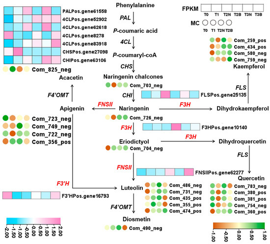 Based on the above studies, we found that flavonoid compounds were especially enriched in T2B, and DEGs were also enriched in the “phenylpropanoid biosynthesis” pathway (Ko00940). The metabolites and genes in the flavonoid biosynthesis pathway (ko00941), represent the most important branch of the “phenylpropanoid biosynthesis” pathway (Ko00940). Therefore, the accumulation patterns of flavonoid compounds and the expression patterns of structural genes involved in the flavonoid biosynthesis pathway were analyzed (Figure 5). We clarified that methylapigenin C-pentoside (Com_356_pos), luteolin (Com_486_neg), methyluteolin C-hexoside (Com_435_pos), diosmetin (Com_490_meg), and quercetin-3′-O-glucoside (Com_783_neg) were significantly enriched in T2B. Two PoC4Ls (Pos.gen8278 and Pos.gene83918), PoF3H (Pos.gene10140), PoF3′H (Pos.gene16793), and PoFNSII (Pos.gene62277) were highly expressed in browning callus (T2B and T3B) (Figure 5). In contrast, the expression of PoPAL (Pos.gene61558), Po4CLb (Pos.gene62618), PoCHI (Pos.gene63106), and PoFLS (Pos.gene25135) in browning callus (T2B and T3B) was higher than that in non-browning callus (T3N and T3B) (Figure 5). Notably, PoF3H and PoFNSII are responsible for the biosynthesis of eriodyctiol, luteolin, and diosmetin. In our study, the expression patterns of PoF3H and PoFNSII were positively correlated with the accumulation patterns of luteolin and diosmetin in the browning callus of P. ostii (Figure 5).