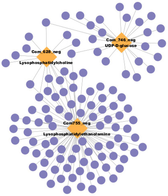 The joint loadings between metabolites and genes were analyzed using O2PLS (Supplementary Figure S7 and Tables S2–S4). The genes and metabolites with the top 25 values are highlighted in red (Supplementary Figure S7). However, no significantly different accumulated metabolites or expressed genes were found between T2B and T2N (Supplementary Figures S8 and S9). The Pearson correlation coefficient between differentially expressed genes (DEGs) and metabolites was calculated, and the correlation network was constructed (Figure 6 and Table S5). We also found that lysophosphatidylethanolamine (com_755_neg) and lysophophatidyloline (com_628_neg), which belonged to lipids, might also be involved in callus browning (Figure 6).