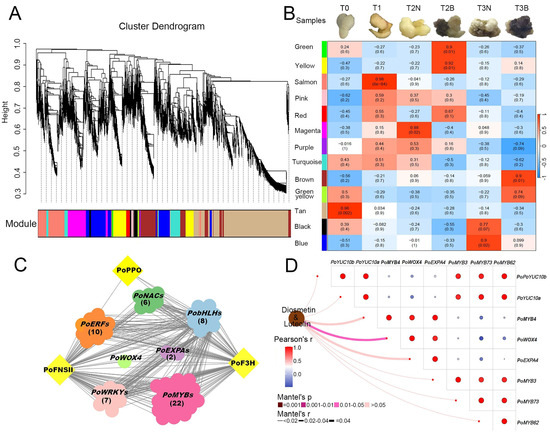 WGCNA analysis of hub genes and the regulatory network for callus browning in P. ostii. (A) The cluster dendrogram of WGCNA analysis. (B) Relationships between sample traits and clustered modules. The correlation coefficient between sample traits and clustered modules are indicated by the data and color shown in each cell (red represents positive correlation, and blue represents negative correlation). (C) The regulatory network of candidate genes involved in callus browning. (D) The correlation analysis between flavonoid compounds (luteolin and diosmetin) and candidate transcription factors. As luteolin is the precursor of diosmetin, we used the accumulation of these two compounds to calculate their correlation with the hub transcription factors.