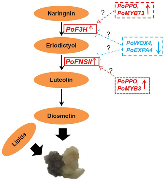 Overall, we proposed a probably molecular mechanism underlying the callus browning in P. ostii, as shown in Figure 8 (Table S9). Along with the accumulation of flavonoid (diosmetin), the expression of PoPPO, PoF3H, PoFNSII, and PoMYB73 increased in browning callus, while the expression of PoWOX4 and PoEXPA4 decreased. Lipids are also implicated in the callus browning process. These results indicate that PoWOX4 and PoEXPA4 might negatively regulate the expression of PoF3H and PoFNSII, thereby inhibiting callus browning in P. ostii. The regulatory relationships among these hub genes need to be validated in further study.