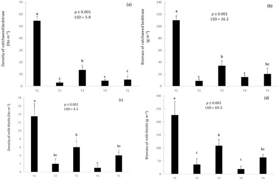 Figure 1. Density of catchweed bedstraw (a), biomass of catchweed bedstraw (b), density of milk thistle (c), and biomass of milk thistle (d). Vertical bars denote standard errors of the means, and different lowercase letters indicate statistically significant differences between the treatments (according to Fisher’s LSD test) (T1: normal seedbed, T2: normal seedbed followed by early post-emergence herbicide application, T3: false seedbed, T4: false seedbed followed by early post-emergence herbicide application, T5: stale seedbed).