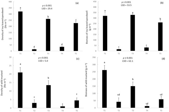 Figure 2. Density of ivy-leaved speedwell (a), biomass of ivy-leaved speedwell (b), density of wild mustard (c), and biomass of wild mustard (d). Vertical bars denote standard errors of the means, and different lowercase letters indicate statistically significant differences between the treatments (according to Fisher’s LSD test) (T1: normal seedbed, T2: normal seedbed followed by early post-emergence herbicide application, T3: false seedbed, T4: false seedbed followed by early post-emergence herbicide application, T5: stale seedbed).