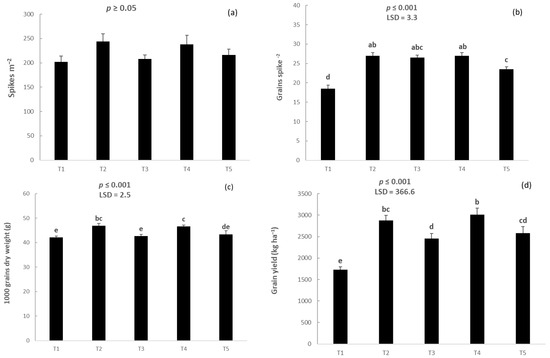 Figure 3. (a) The number of spikes per unit area (spikes m−2), (b) the number of grains per spike (grains spike−1), (c) the weight of 1000 grains (g), and (d) the final grain yield of durum wheat (kg ha−1). Vertical bars denote standard errors of the means, and different lowercase letters indicate statistically significant differences between the treatments (according to Fisher’s LSD test) (T1: normal seedbed, T2: normal seedbed followed by early post-emergence herbicide application, T3: false seedbed, T4: false seedbed followed by early post-emergence herbicide application, T5: stale seedbed).