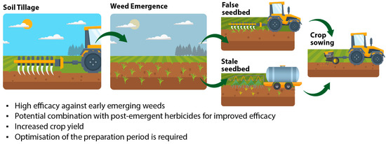 False and stale seedbeds are formed when the field is prepared for sowing, and weeds are provoked to germinate after initial tillage operations and later destroyed by means of a shallow tillage operation or herbicide application, respectively [9,10]. However, the efficacy of such farming practices on weed control varies widely based on many factors, including the crop, the weed community, the nutrients, the tillage, and the specific soil and climatic conditions [11,12,13,14]. For instance, false seedbed in barley reduced the biomass of weed by up to 64% compared with direct sowing and normal seedbed preparation [9]. The application of this specific method in crops like rice, soybean, and cotton also reduced weed density and increased crop yield [15,16]. Despite these potential benefits, there are cases like in compact soils with heavy rainfall in which false seedbed can significantly delay crop establishment and put crop productivity at risk [17].