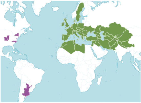 Distribution of the genus Arum in the world. Green—native range, purple—non-native range [9].
