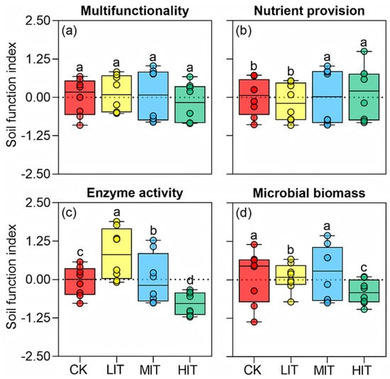 Variations in soil multifunctionality (a) and its nutrient provision (b), enzyme activity (c), and microbial biomass (d) under different thinning intensities in CFPs. Columns represent the mean ± standard error (n = 4). Different lowercase letters represent significant differences among thinning intensities of the CFPs (p < 0.05, Tukey’s test). Nutrient provision (b) includes SOC, TN, TP, AN, AP, NH4+, NO3−, DON, DOC, and EOC. Enzyme activity includes βG, NAG, LAP, and ACP. Microbial biomass includes MBC, MBN, B-PLFAs, and F-PLFAs. CK, control (0%); LIT, light-intensity thinning (20%); MIT, medium-intensity thinning (30%); HIT, high-intensity thinning (45%).