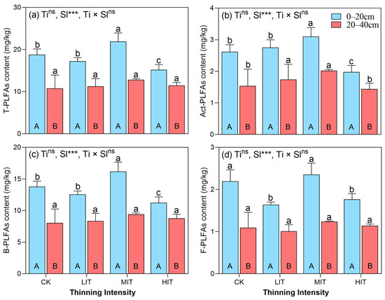 Vertical distribution of T-PLFA (a), Act-PLFA (b), B-PLFA (c), and F-PLFA (d) contents under different thinning intensities in CFPs. Columns represent the mean ± standard error (n = 4). Different uppercase and lowercase letters represent significant differences among the soil layers and thinning intensities of CFPs, respectively (p < 0.05, Tukey’s test). *, **, and *** indicate significance at p < 0.05, p < 0.01, and p < 0.001, respectively, and “ns” represents no significant differences (p > 0.05). CK, control (0%); LIT, light-intensity thinning (20%); MIT, medium-intensity thinning (30%); HIT, high-intensity thinning (45%). PLFAs, phospholipid fatty acids; T, total; Act, actinomycetes; B, bacteria; F, fungi. Ti, thinning intensity; Sl, soil layer; Ti × Sl, interaction between thinning intensity and soil layer.