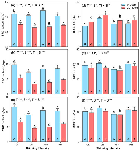The BRC content showed the significant effects of thinning intensity (p < 0.001), soil layer (p < 0.001), and their interaction (p < 0.01). In the 0–20 cm layer, BRC content was highest under medium-intensity thinning (MIT, 1.95 ± 0.10 g/kg), followed by CK (1.77 ± 0.18 g/kg), LIT (1.67 ± 0.15 g/kg), and HIT (1.64 ± 0.09 g/kg). In this layer, MIT increased BRC content by 10% compared to CK, while LIT and HIT resulted in reductions of 6% and 8%, respectively. In the 20–40 cm layer, BRC content was highest under CK (1.20 ± 0.06 g/kg), followed by HIT (1.15 ± 0.19 g/kg), MIT (1.09 ± 0.17 g/kg), and LIT (1.03 ± 0.18 g/kg), with reductions of 4%, 9%, and 14%, respectively, under the thinning treatments compared to CK. The mean BRC content across both soil layers was significantly higher under MIT and CK than under LIT and HIT (Figure 3a).