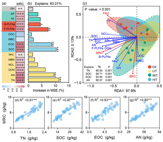 Correlation heatmap (a), random forest analysis (b), and redundancy analysis (c) of the relationship between soil biotic and abiotic factors and MRC under different thinning intensities in CFPs (n = 32). Regression analysis (d–g) of soil C, N fractions, and microbial PLFAs with MRC (n = 32). *, **, and *** indicate significance at p < 0.05, p < 0.01, and p < 0.001, respectively. SOC, soil organic carbon; TN, total nitrogen; TP, total phosphorus; AP, available phosphorous; AN, available nitrogen; MBN, microbial biomass nitrogen; MBC, microbial biomass carbon; EOC, easily oxidized organic carbon; NH4+, ammonium nitrogen; NO3−, nitrate nitrogen; DON, dissolved organic nitrogen; DOC, dissolved organic carbon; MRC, microbial residue carbon. PLFAs, phospholipid fatty acids; T, total; B, bacteria; F, fungi; Act, actinomycetes. GH, geometric mean of the hydrolase. CK, control (0%); LIT, light-intensity thinning (20%); MIT, medium-intensity thinning (30%); HIT, high-intensity thinning (45%).