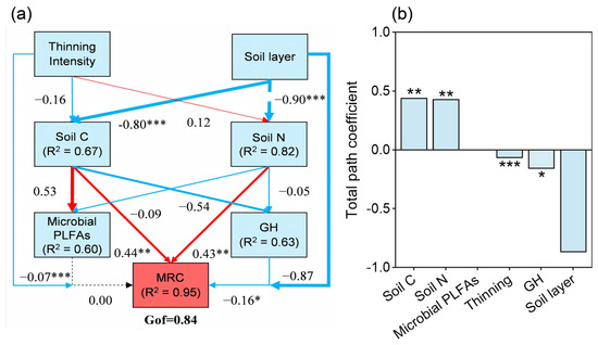 The partial least squares path model (PLS-PM) (a) and total path coefficient (b) showing the effects of thinning intensity, soil layer, soil C, soil N, microbial PLFAs, and GH on MRC accumulation in CFPs (n = 32). Red solid lines indicate positive paths, blue solid lines indicate negative paths, and black dashed lines indicate non-significant paths. The numbers beside the arrows represent path coefficients. *, **, and *** indicate significance at p < 0.05, p < 0.01, and p < 0.001, respectively. Soil C, soil carbon fractions (SOC, EOC); Soil N, soil nitrogen fractions (TN, AN); Microbial PLFAs, microbial phospholipid fatty acids (B-PLFAs, F-PLFAs); GH, geometric mean of four hydrolase enzymes (βG, NAG, LAP, and ACP); MRC, microbial residue carbon; Gof, goodness of fit.