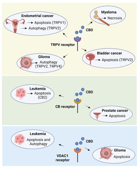 CBD inducing cancer cell death via TRPV, CB and VDAC1 receptors. CBD primarily activated the apoptosis death pathway, and in some cases, it activated autophagy, necrosis, or a combination of apoptosis and autophagy. The receptors responsible for the action of CBD were mostly TRPVs. In endometrial cancer cells, CBD activates apoptosis and autophagy via TRPV1 and TRPV2 receptors, respectively. In glioma, CBD activates autophagy and apoptosis via TRPV2 and TRPV4 receptors. TRPVs may be involved in the activation of necrosis in myeloma and bladder cancer, and TRPV2 is involved in the action of CBD in activating apoptosis. Cannabinoid receptors (CB), although few studies have demonstrated their action in this review, are also involved in the action of CBD in prostate cancer cell lines and leukemia, specifically CB2. Additionally, receptors present in mitochondria (VDAC1) have been shown to be involved in the action of CBD against leukemia and glioma. Created with Biorender.