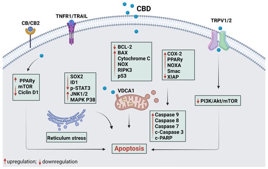 Apoptosis, a programmed cell death, is often inhibited in cancer due to the overexpression of anti-apoptotic proteins and downregulation of pro-apoptotic proteins. However, most of the studies included here reported that CBD can effectively inhibit tumor cell proliferation by inducing apoptosis (Table 3) [,].