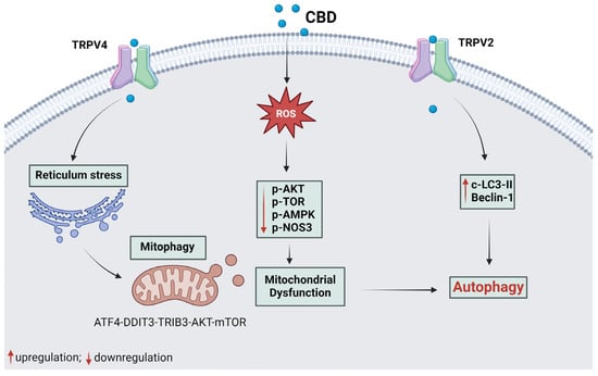 The mechanism of CBD in tumoral cell death by the autophagic pathway. Cannabidiol binds to TRPV2 and TRPV4 receptors and activates proteins responsible for activating autophagy due to oxidative stress of the endoplasmic reticulum and mitochondrial dysfunction. CBD binds to the TRPV4 receptor and leads to cell death by mitophagy through the TRPV4-ATF4-DDIT3-TRIB3-AKT-MTOR axis. Autophagy is activated by CBD due to the presence of ROS, triggering endoplasmic reticulum stress and mitochondrial dysfunction. Thus, CBD promotes the downregulation of cell survival proteins (p-AKT, p-TOR, p-AMPK, and p-NOS3) and upregulates proteins involved in autophagy, such as LC3-II and beclin-1, due to TRPV2 activation. c-, cleaved; p-, phosphorylated. Red arrows indicate the increase or decrease in protein expression. Black arrows indicate the order of the pathway represented. Created with Biorender.