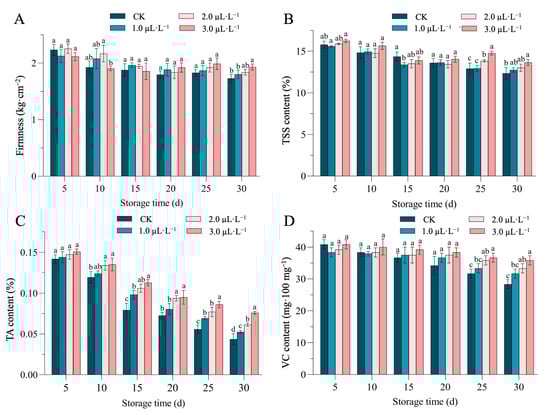 Fruit firmness is an indicator that reflects the quality changes and softening degree of fruits during postharvest storage. In this experiment, the overall fruit firmness showed a decreasing trend with the increase in storage time (Figure 2A), and the fruits with control (CK) treatment showed the most significant decrease on the 5th-10th day due to obvious nutritional depletion. The fruit firmness was significantly higher in the fruit groups treated with 1.0 µL·L−1 and 3.0 µL·L−1 concentrations of the 1-MCP than that of the control group on the 30th day, and there was no significant difference compared to the 2.0 µL·L−1 of the 1-MCP group (p < 0.05), respectively. However, the fruit group treated with the 3.0 µL·L−1 concentration of the 1-MCP had the best effect in inhibiting the decrease in fruit firmness.