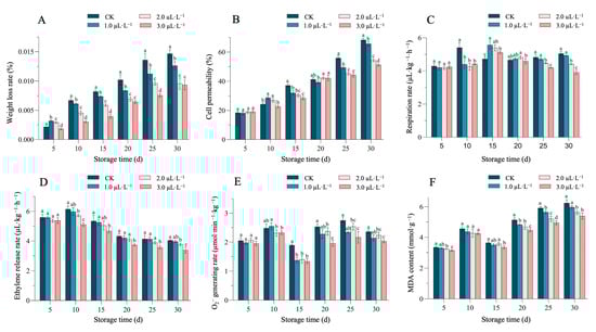 MDA is the final product of lipid peroxidation, and its accumulation indicates the presence of oxidative free radicals in cells, which disrupt cell membrane structure and interfere with normal physiological metabolism. In this postharvest study, the obtained results showed that the group samples treated with 3.0 µL·L−1 of 1-MCP concentration showed significantly lower malondialdehyde content than that in the control group and the other two 1-MCP treatment groups (Figure 3F).