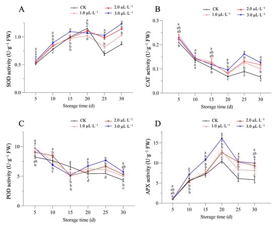 In addition, the APX content (U·g−1) remained significantly higher in the sample groups treated with 3.0 µL·L−1 of 1-MCP concentration than in other 1-MCP treatment groups and the control group during 10–20 days. However, peaks were observed in all treated groups on the 20th day of storage, and the highest peak was observed in the 3.0 µL·L−1 treatment group, reaching up to 16.09 U·g−1 and showing a decreasing trend in the later stages (Figure 4D).