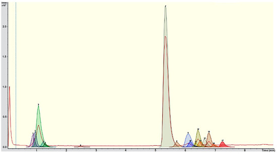 UPLC-ESI-qTOF-MS/MS chromatogram of the Laelia furfuracea leaf extract. The red line represents the baseline chromatogram. The identified compounds are listed as follows: 1 (unidentified), 2 (malic acid), 3 (citric acid), 4 (succinic acid), 5 (hydroxymethylglutaric acid), 6 (procatechuic acid), 7 (eucomic acid), 8 (luteolin-7,3′-di-O-glucoside), 9 (saponarin), 10 (isoorientin), 11 (vitexin), 12 (unidentified), 13 (flavonoid glucoside derived from isoorientin), 14 (unidentified), 15 (flavonoid glucoside derived from vitexin), 16 (iridoid glucoside), and 17 (azelaic acid).