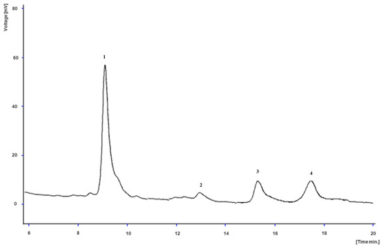 | 8 | 11.04 | 267/302/342 | 595 | MS2 (595): 300 (100), 301 (54), 595 (34) | Quercetin pentosyl-hexoside [65] | 0.28 ± 0.01 b | 0.230 ± 0.002 c | 0.38 ± 0.02 a | 0.090 ± 0.003 d |