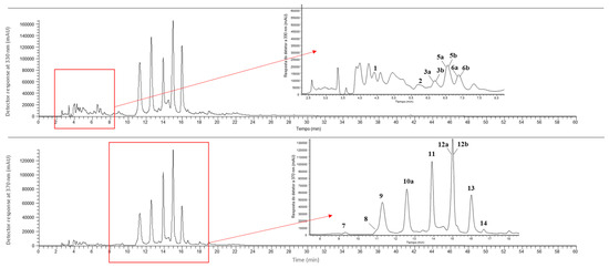| Peak n.° | Rt (min) | λmax (nm) | [M–H]– (m/z) | MS2 Fragments (m/z) | Tentative Identification | Quantification (mg/g of Extract) | ||