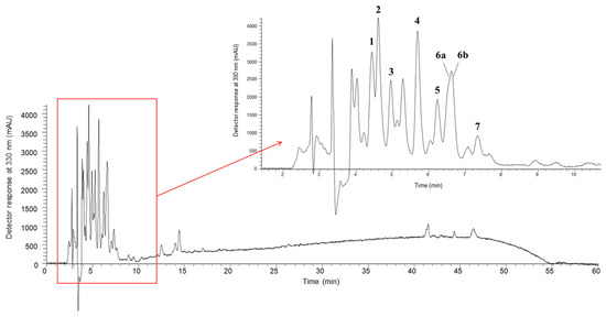 | 5a * | 6.60 | 230 | 387 | MS2 (387): 163 (100), 387 (68), 119 (8), 388 (5), 164 (4), 207 (2), 369 (2) | Medioresinol 2 [69,70,72,73] | 0.530 ± 0.002 c | 0.88 ± 0.02 a | 0.74 ± 0.01 b | 0.890 ± 0.004 a |