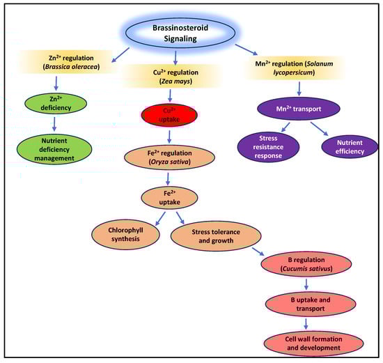 On the contrary, it is also essential to maintain a balance of the micronutrient concentration in plants as it could lead to micronutrient toxicity, which could further endanger the plant growth and development through reduced growth, oxidative stress, leaf tip necrosis, and more []. In this regard, micronutrient homeostasis emerges as a crucial factor that offers optimal availability and proper functioning while preventing toxicity due to overaccumulation by tightly regulating micronutrient uptake, transport, storage, and utilization []. Hormonal regulation, specific transporter proteins, and signaling molecules are some of the methods employed by plants to maintain optimum micronutrient levels. While extensive studies on traditional plant growth hormones like gibberellins, auxins, and cytokinins have been conducted in terms of nutrient uptake and plant growth, their scope remains limited in exploring the role played by these hormones in micronutrient homeostasis. Even though many studies have explored the crosstalk between micronutrients and phytohormones, not many have reflected the role played by these phytohormones in micronutrient homeostasis beyond being crucial in managing abiotic and biotic plant stresses. This has caused researchers to investigate plant hormones past the traditional ones, such as brassinosteroids (BRs), that have shown promising roles in plant stress resilience and micronutrient homeostasis.