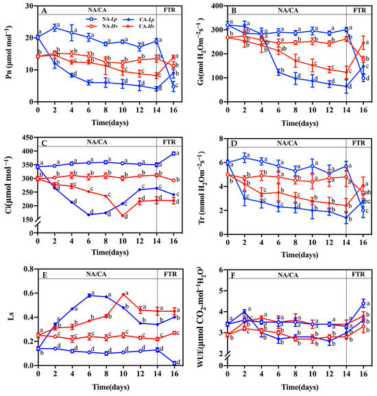 Stomatal conductance (Gs) and the transpiration rate (Tr) showed similar trends in the Pn in both species and different treatments (Figure 1B,D). The leaves presented significantly higher Gs after the 6th day but a significantly higher Tr before the 6th day in NA-Lp than NA-Hv. Gs significantly decreased from the 6th day in Lp and the 8th day in Hv during CA (Figure 1B). However, significant declines of the Tr were also observed from the 2nd day between NA-Lp and CA-Lp, and the 8th day between NA-Hv and CA-Hv (Figure 1D). As a result, there was a significantly lower Gs from the 6th day in CA-Lp than CA-Hv but no notable differences of the Tr between CA-Lp and CA-Hv. After the FTR treatment, Gs and the Tr significantly decreased in both species of the NA treatment but increased in those of the CA treatment. Nevertheless, the values of Gs and the Tr in both species did not reach the significant difference between NA and CA treatments except that there was a significantly higher Gs in CA-Hv than NA-Hv after the FTR treatment.