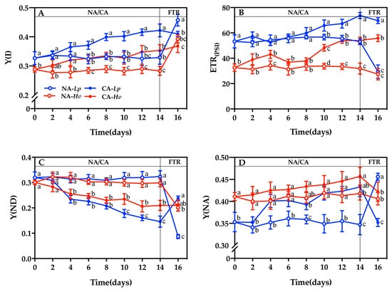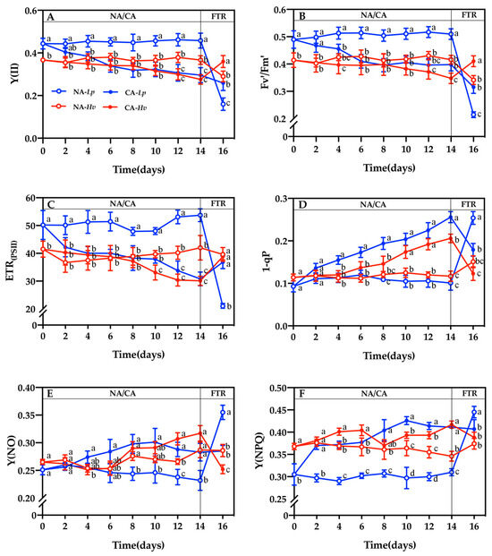 The actual photosynthetic efficiency of PSII (Y(II)), the efficiency of excitation energy capture by open PSII reaction centers (Fv′/Fm′), and the PSII photosynthetic electron transport rate (ETR(PSII)) were significantly higher in NA-Lp than in NA-Hv during the 14-day period at 23/16 °C (Figure 3A–C). These parameters declined in both species under CA, with significant differences in Y(II) and Fv′/Fm′ observed from the 4th day in CA-Lp and the 12th day in CA-Hv. ETR(PSII) declined significantly throughout CA in CA-Lp and from the 10th day in CA-Hv. Except for a higher Fv′/Fm′ on the 2nd day in CA-Lp, there were no significant differences in these parameters between CA-Lp and CA-Hv. After the FTR, Y(II) and Fv′/Fm′ decreased significantly in NA-treated plants but increased in CA-Hv, resulting in higher values in the CA-treated plants of both species. ETR(PSII) declined sharply in NA-Lp but increased significantly in CA-Lp and CA-Hv. A significantly lower ETR(PSII) was found in NA-Lp than NA-Hv, CA-Lp and CA-Hv.