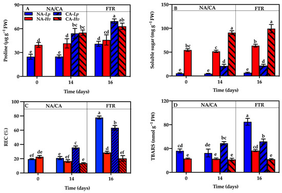 Thiobarbituric acid reactive substances (TBARS) contents showed a tendency very similar to the REC values (Figure 6D). There was no TBARS difference between the two species after 14 days of growth at 23/16 °C. The CA treatment significantly enhanced the TBARS content in CA-Lp but did not alter it in CA-Hv. After the FTR treatment, the TBARS contents significantly increased in the seedlings of Lp but remained unchanged in the seedlings of Hv. Consequently, there were higher TBARS contents in the CA-treated seedlings than in the NA-treated seedlings of both species.