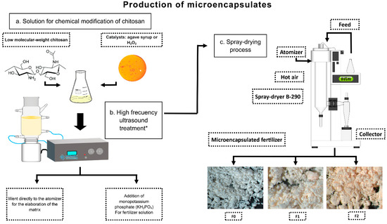 Several physical, chemical, and biological methods can be used to modify chitosan [35]. With improved performance through modification, the application of chitosan-based materials can be expanded to different fields, such as water treatment, food processing, pharmaceuticals/biomedicine, textiles, and—as demonstrated in this study—agriculture. Figure 1 shows a schematic representation of the workflow, and the methodology used (now patented [36]), illustrating the modifications made to the chitosan via high-frequency ultrasound irradiation to generate an encapsulant matrix and the implementation of the spray drying technique for fertilizer encapsulation.