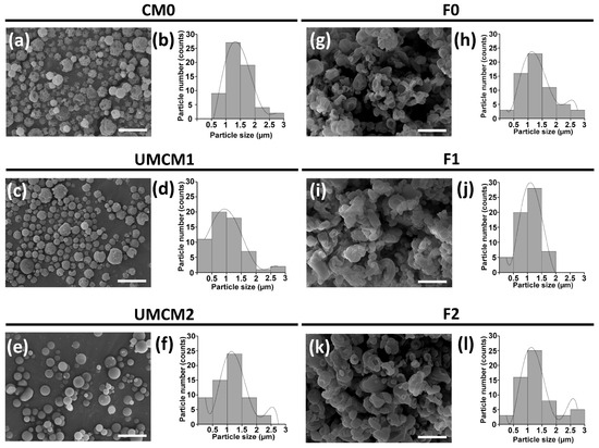 Morphological characterization of the innovative fertilizers and the encapsulant matrices used to generate them. SEM images (a,c,e,g,i,k) and histograms of the diameter ranges of the microspheres formed with both the encapsulant matrix (chitosan, CM0, and modified chitosan, UMCM1 and UMCM2; (b,d,f)) and innovative phosphate fertilizers (F0, F1, and F2; (h,j,l), respectively). Scale bar = 5 µm; 5000× magnification.