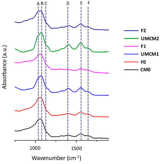 Comparison of the FTIR spectra of the innovative fertilizers (F0, F1, and F2) and the encapsulant matrices used to generate them (CM0, UMCM1, and UMCM2, respectively). The dotted lines (A–F) indicate the six characteristic maximal absorption bands of some functional groups of chitosan.