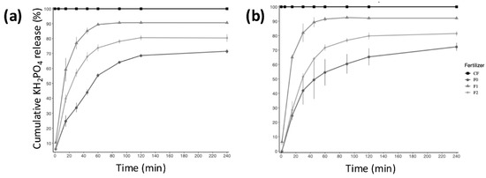 Pi release kinetics in water at pH 6.0 (a) and 4.0 (b) for the innovative fertilizers, i.e., microspheres in which Pi is encapsulated by chitosan or ultrasonic-modified chitosan (formulations F0, F1, and F2, respectively). The release kinetics of the conventional fertilizer (CF) are also shown.